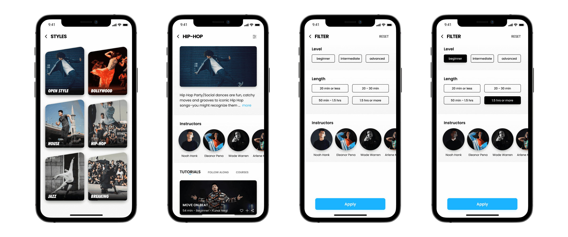 Users can explore different dance styles with intelligent filtering by skill level, duration, and specific teachers. Each style gets its own visual identity while maintaining platform consistency.