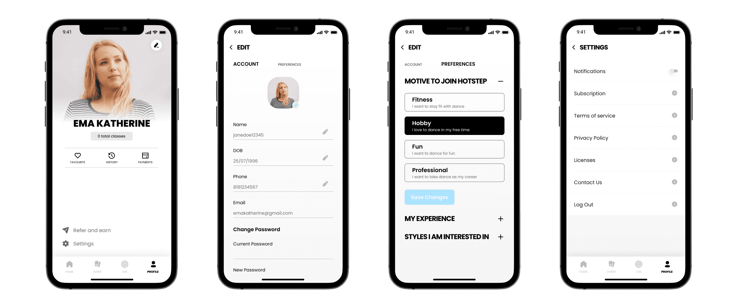 The profile section displays all user activity, viewing history, and payment records. Users can update personal information and preferences while tracking their dance journey progress.