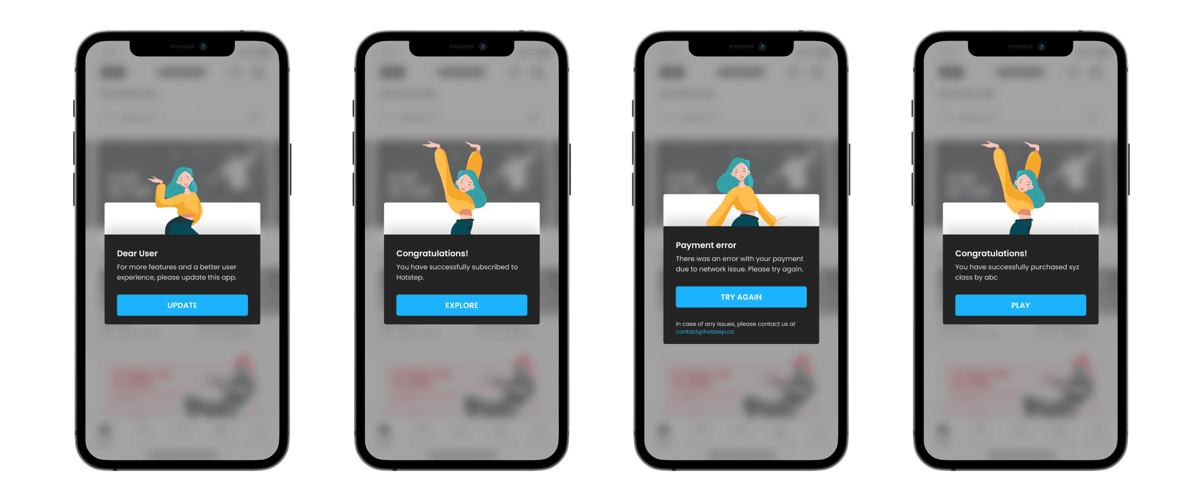 Custom popups were designed for various events including class completion, purchases, app updates, and payment issues. Each popup uses illustrations that evoke appropriate emotions like celebration or encouragement.