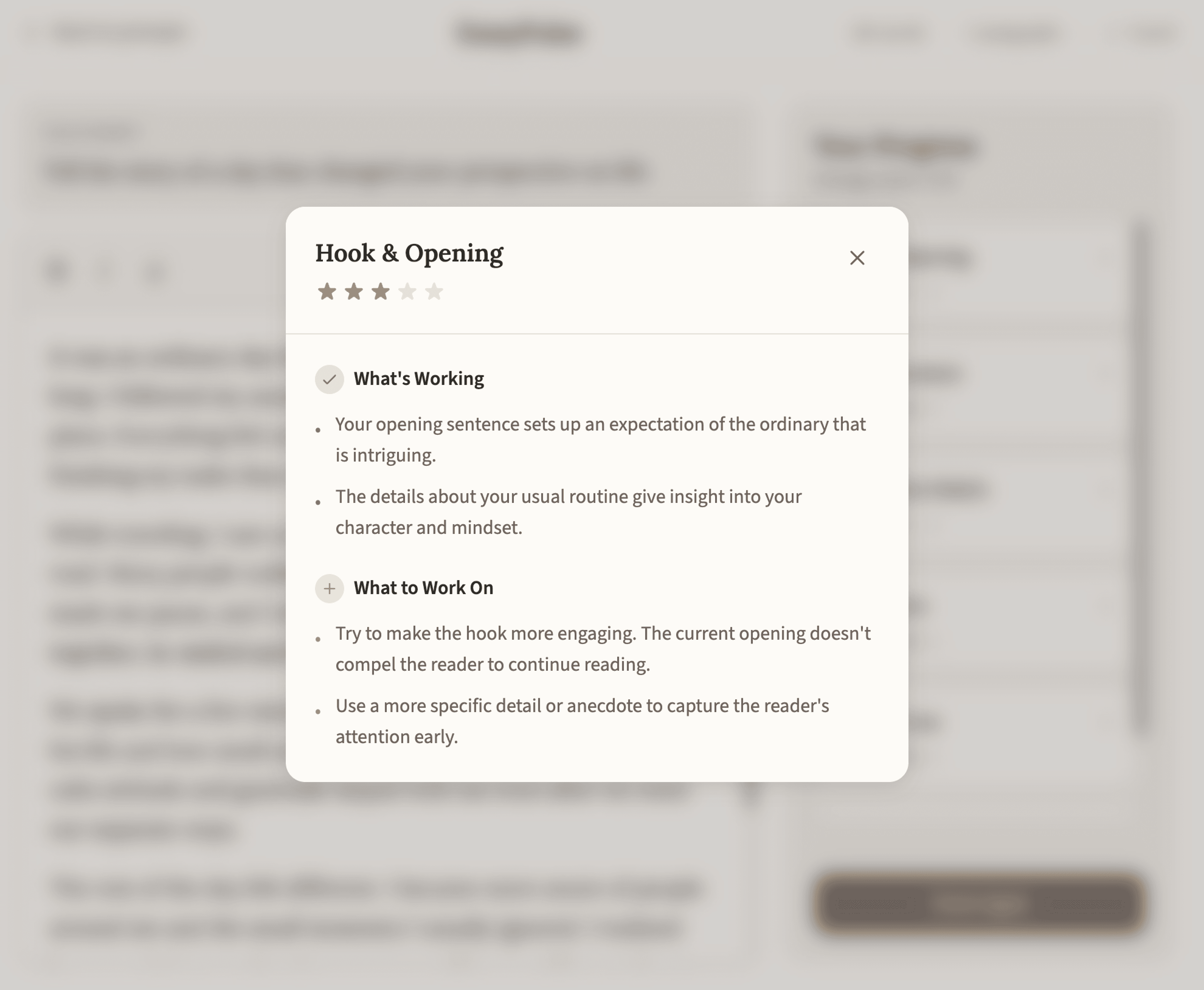 Clicking a trait opens detailed feedback: what's working, what to improve