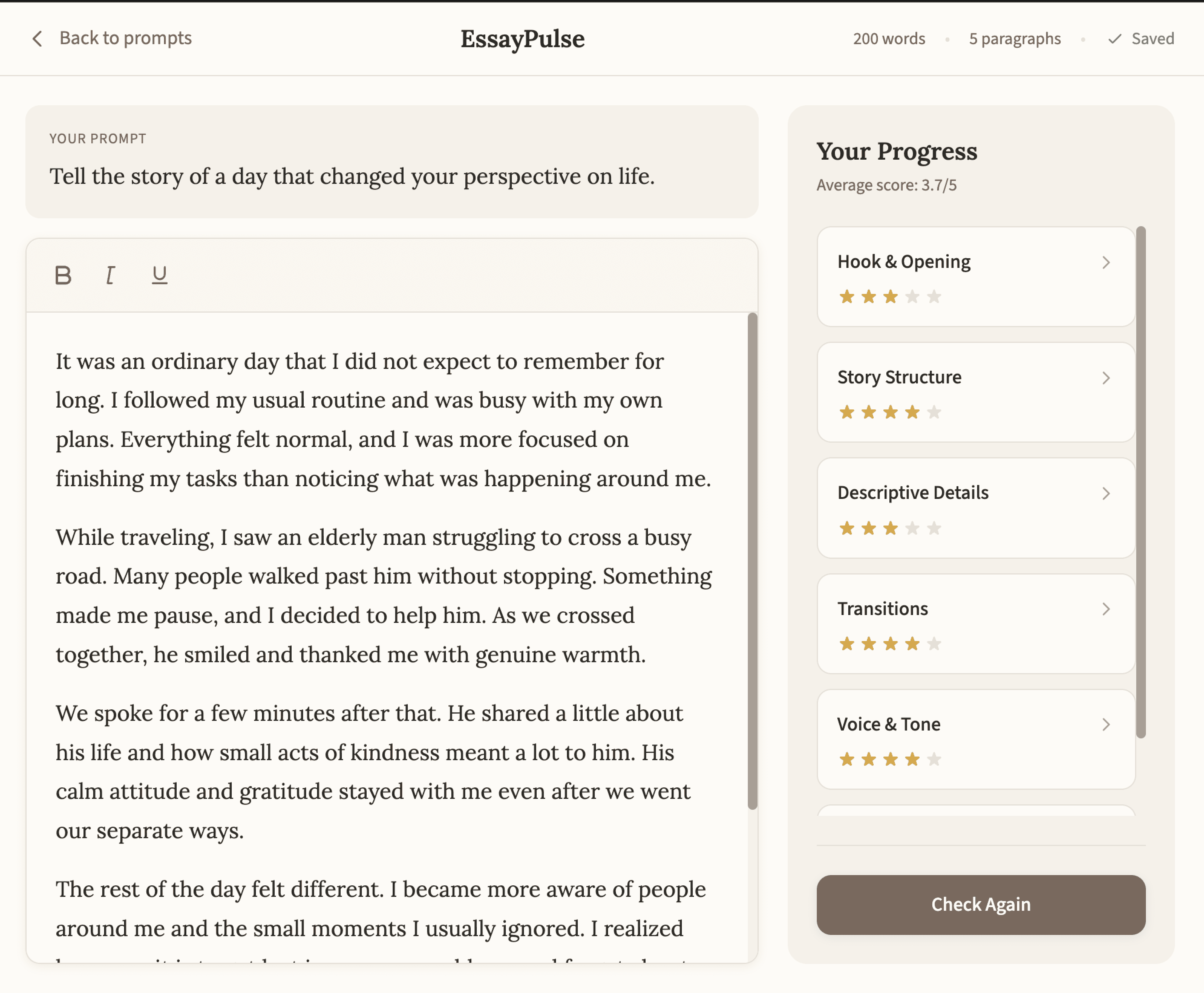 We saw a gap. What if students could get instant feedback while practicing? Not a grade, but guidance. "Your opening is strong, but your transitions need work." Something that helps them improve before the test that actually counts.