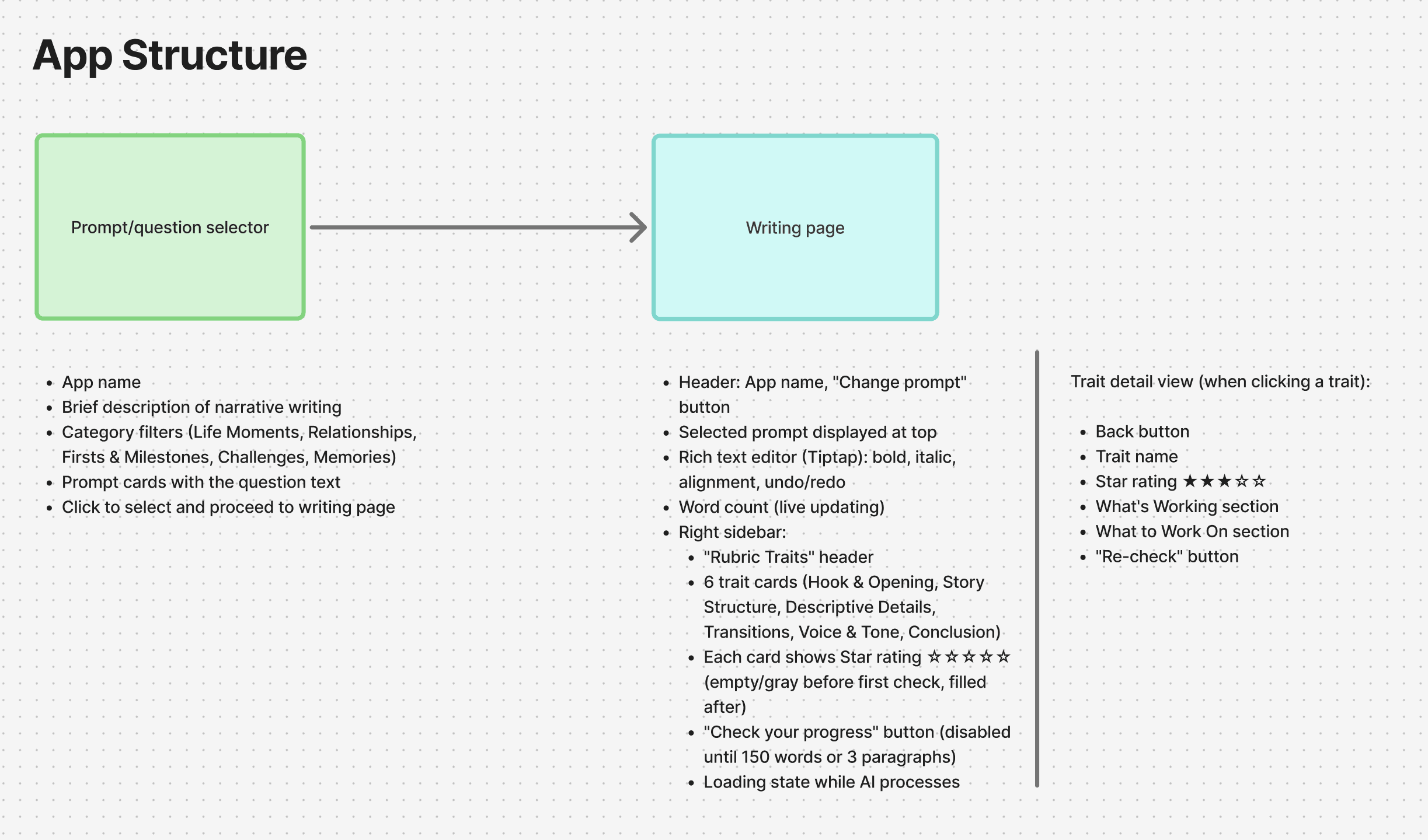 The pages to build are the prompt selector page and the writing page.