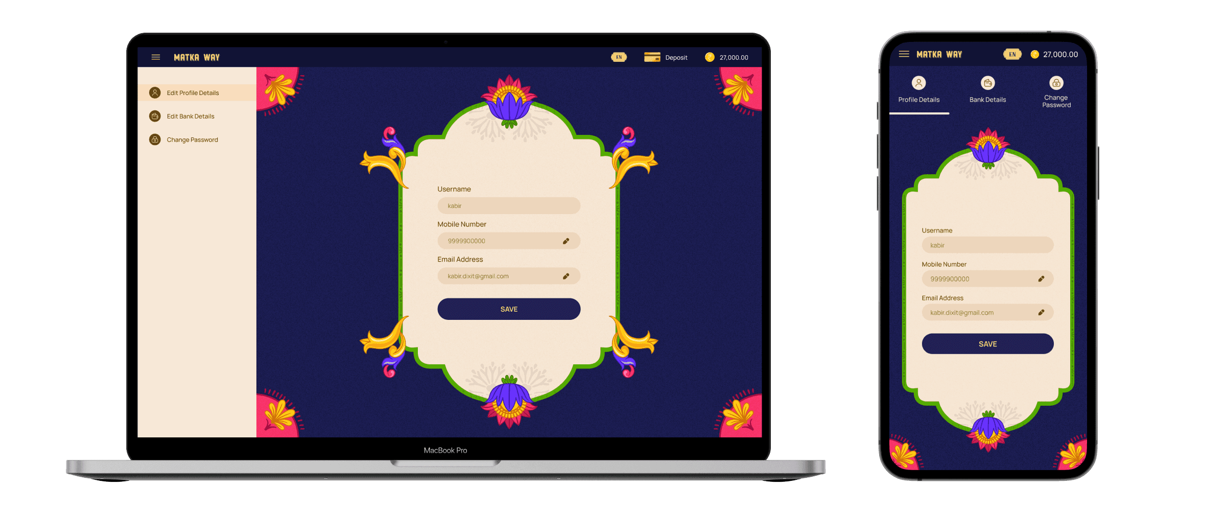 Profile editing maintains the Indian aesthetic with decorative flower corners while providing all necessary functionality for account management, bank details, and password updates.