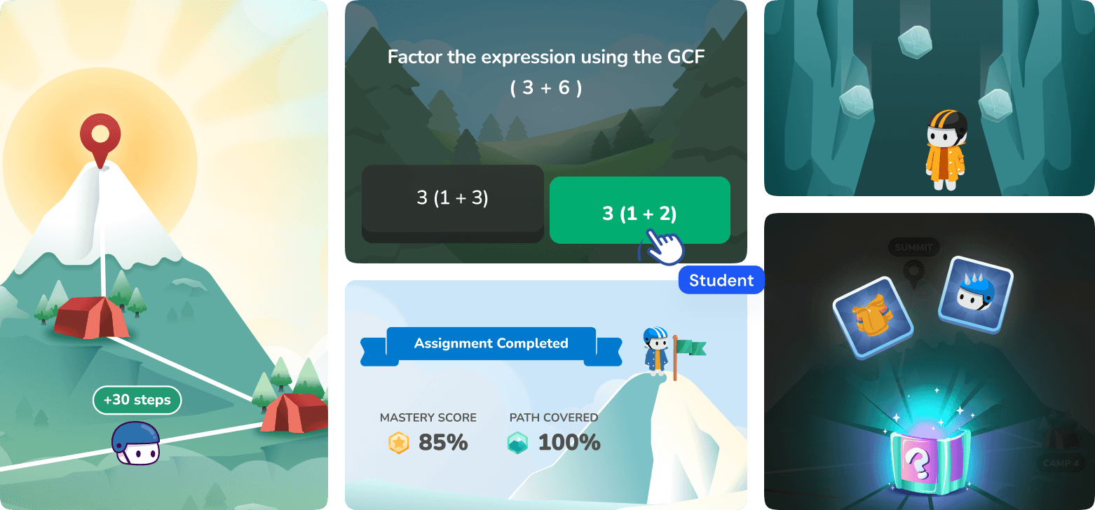 We built a 🏔️ mountain-climbing adventure where correct answers move students ⬆️ up the trail, wrong answers trigger helpful 🎯 StepGuide moments, and major milestones unlock 🏕️ celebrations with friends.